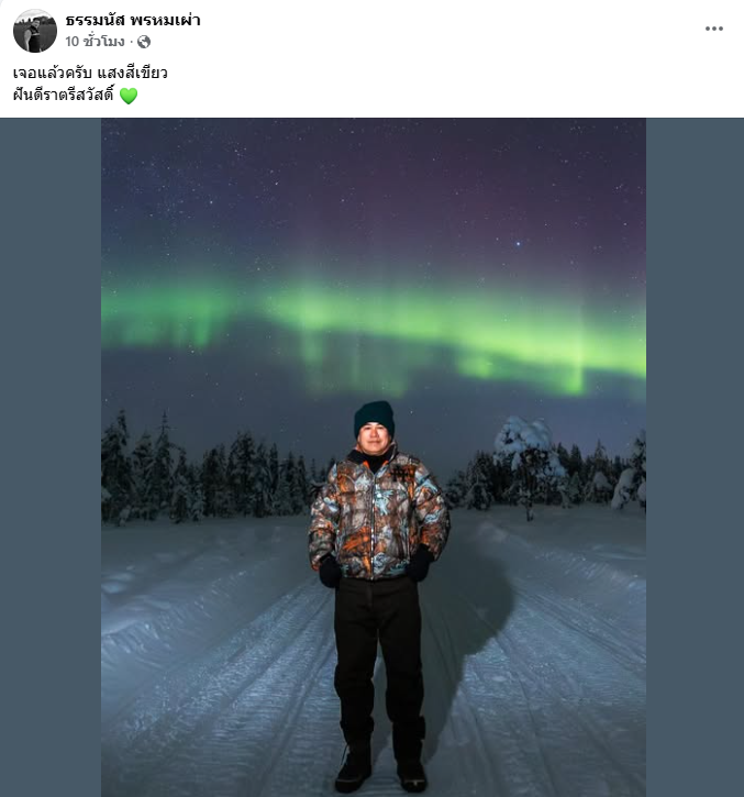 เป็นภาพปรากฏการณ์แสงเหนือ หรือ ออโรร่า (Aurora) ลำแสงสีเขียวทอดยาวพาดผ่านท้องฟ้ายามค่ำคืน เบื้องหลังเป็นทิวทัศน์ป่าสนที่ปกคลุมด้วยหิมะอย่างสวยงาม พร้อมข้อความระบุว่า เจอแล้วครับ แสงสีเขียว ฝันดีราตรีสวัสดิ์ และอิโมจิหัวใจสีเขียว